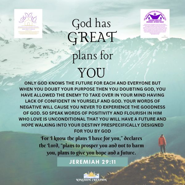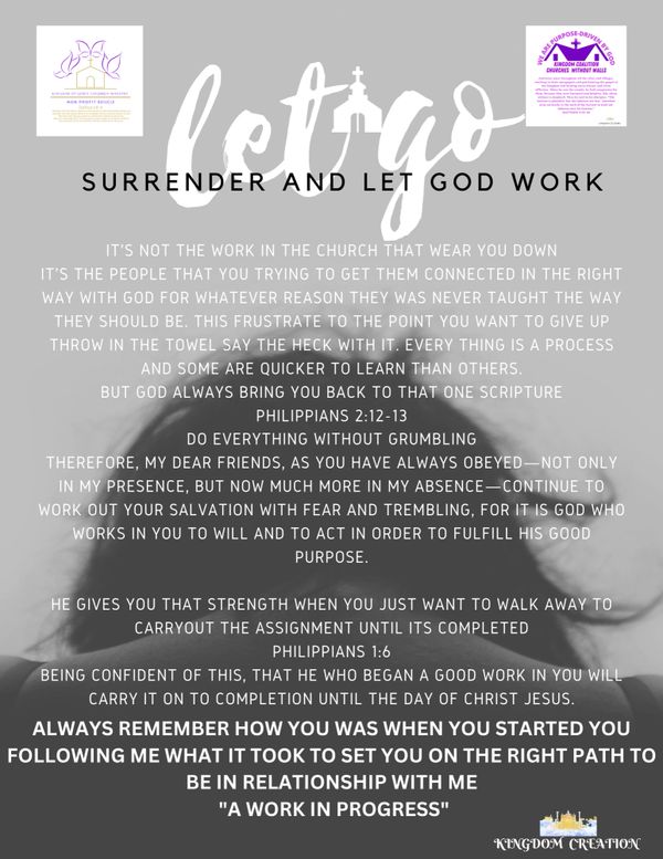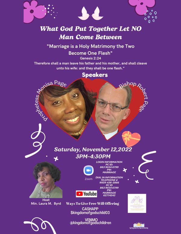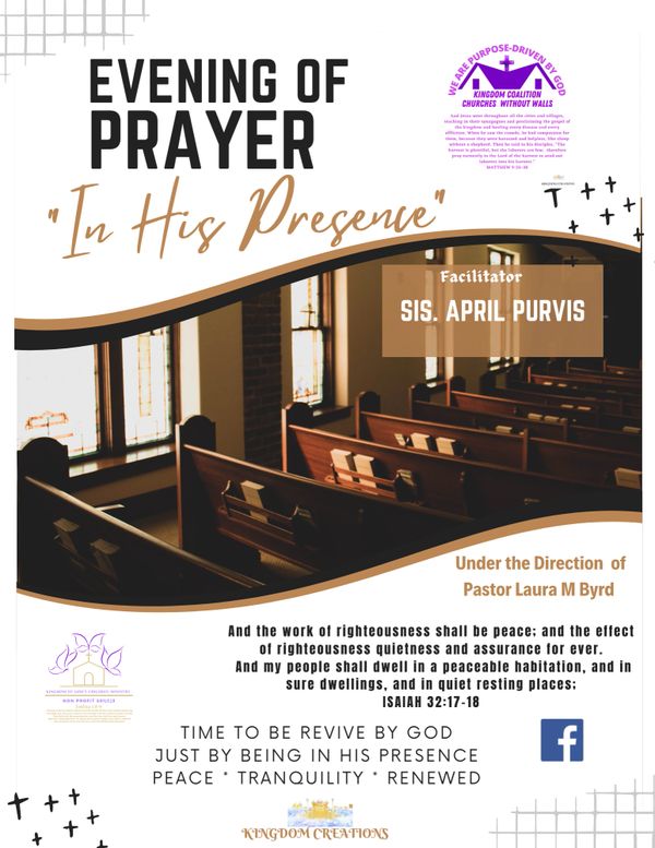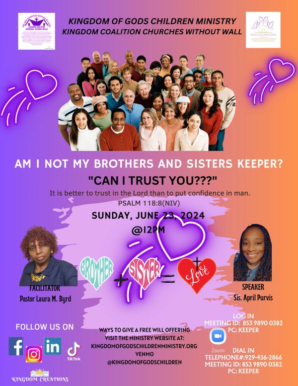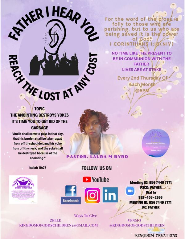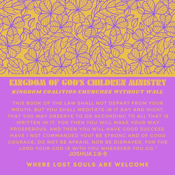 In 1995 Kingdom of God's children was formed out of hurt and pain that I endured as a wife in an abusive relationship, which God saved me from because of the calling on my life to be able to help those in the same situation to get in the right relationship with Him in order to help them in his will and way that they will know him as the LORD of their life. This ministry will continue to strive as God has mandated, planned, and purposed it to be run in order that many will see the salvation if the Lord in their life to bring them to a place of His abundance. We are a Purpose Driven ministry to go to uncharted territories.