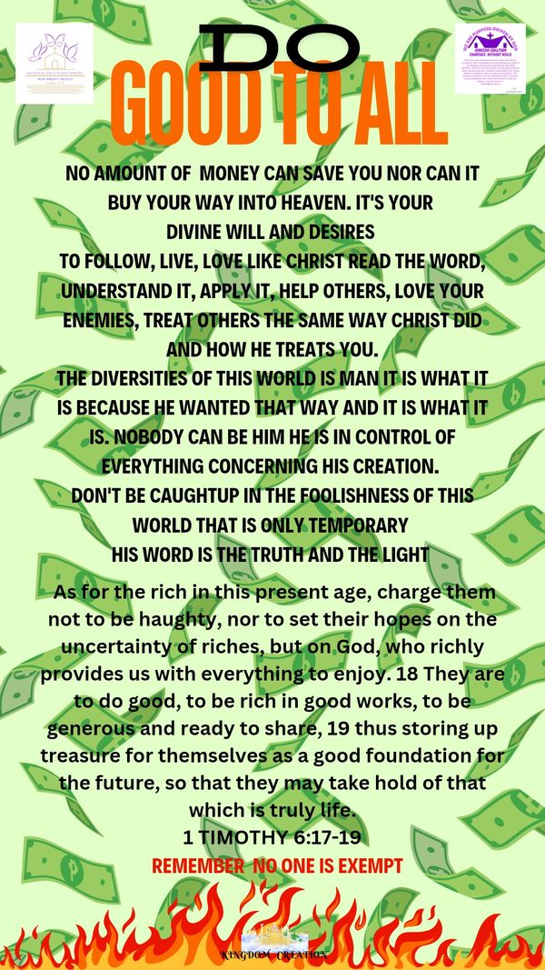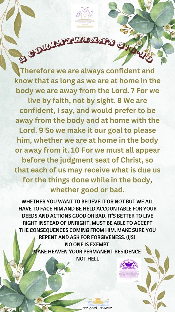 Our mission is to spread the truth to all who has ears to hear the infallible word of God that they will be saved, set free, and live eternally with Him. We aim to win souls at any cost. To go to communities to help in anyway possible to meet the need of all and not a specific class of people.
